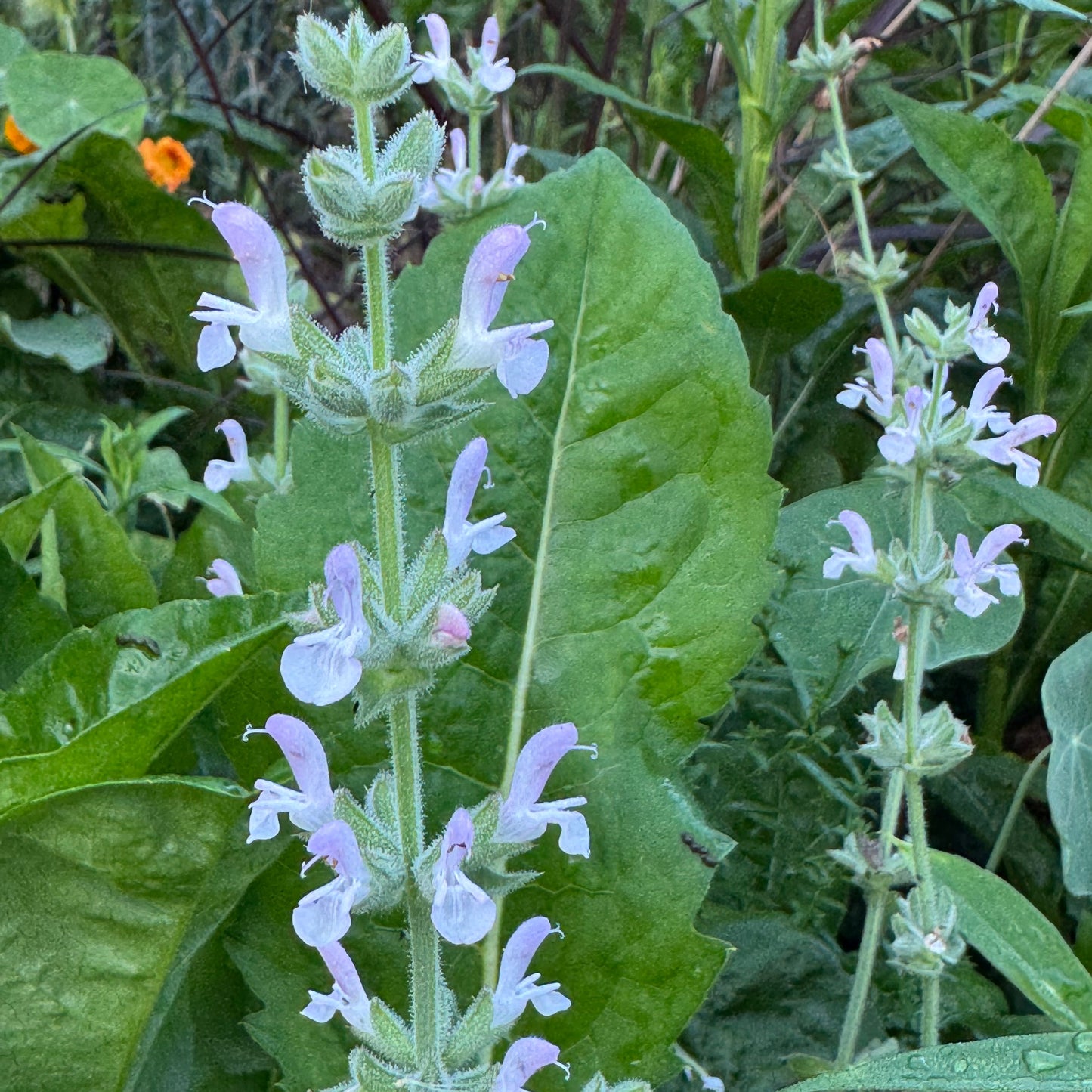 Tough evergreen salvia with grey green long arrow shaped leaves and very pale pink flowers. Full sun or light shade. Drought and frost tolerant. Cut back after flowering. 60-80cm.